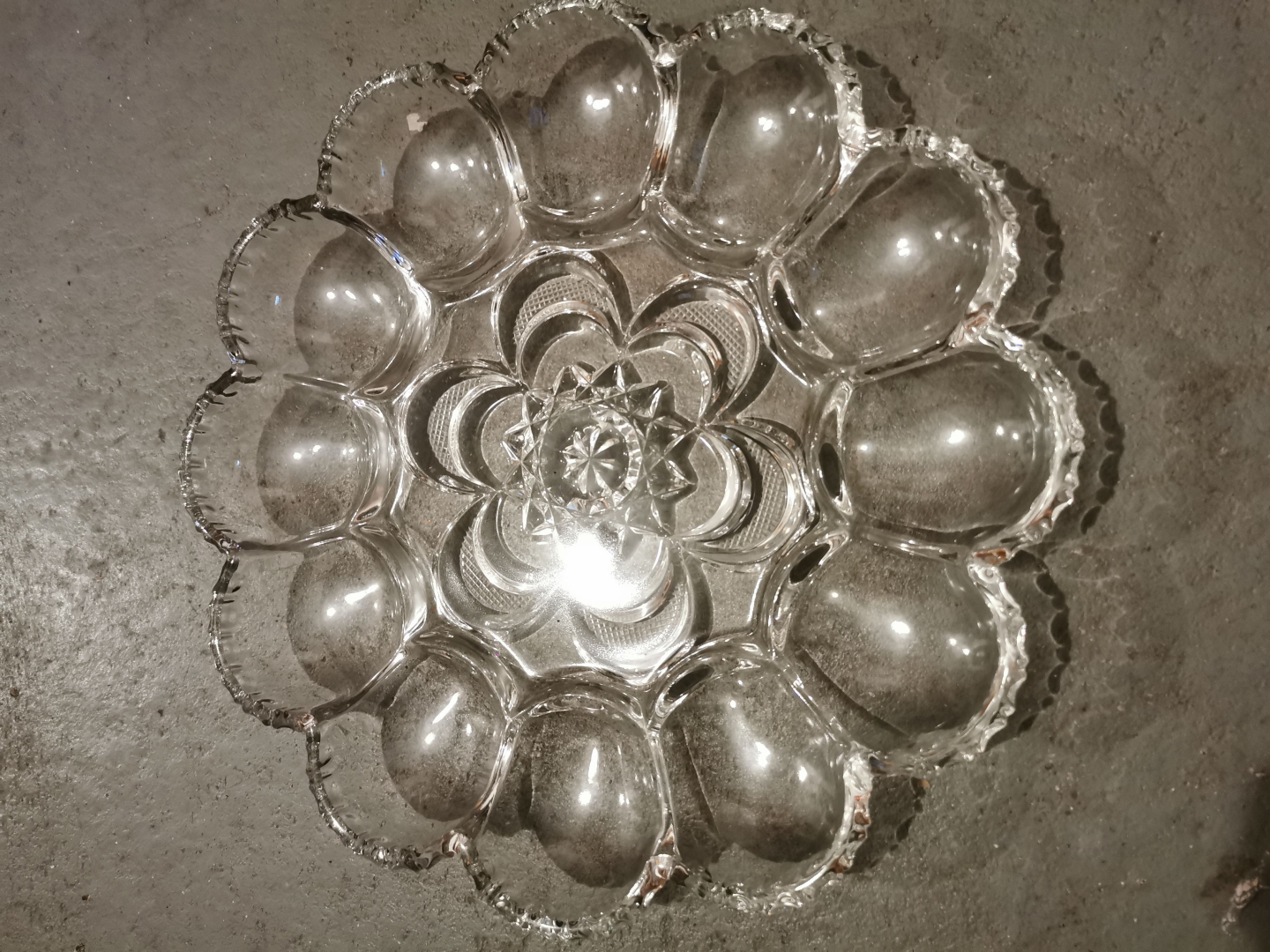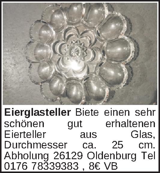 Biete einen sehr schönen gut erhaltenen Eierteller aus Glas, Durchmesser ca. 25 cm. Abholung 26129 Oldenburg Tel 0176 78339383