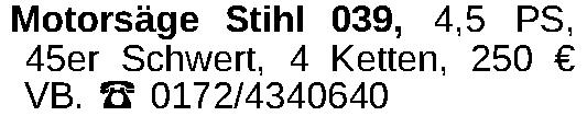 Motorsäge Stihl 039, 4,5 PS, 45er Schwert, 4 Ketten, 250 € VB. 0172/4340640