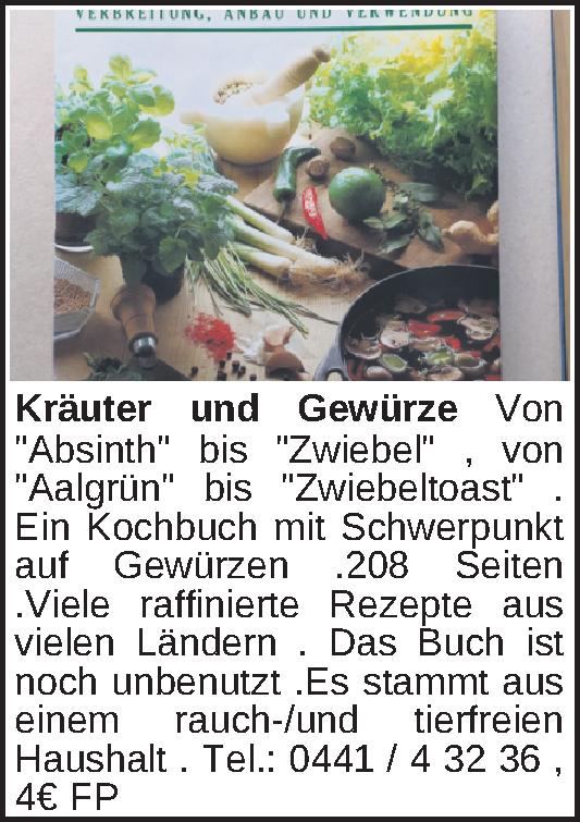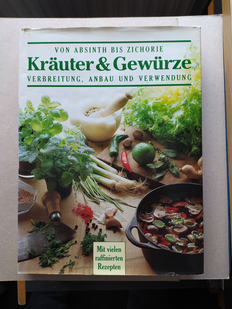 Von "Absinth" bis "Zwiebel" , von "Aalgrün" bis "Zwiebeltoast" . Ein Kochbuch mit Schwerpunkt auf Gewürzen .208 Seiten .Viele raffinierte Rezepte aus vielen Ländern . Das Buch ist noch unbenutzt .Es stammt aus einem rauch-/und tierfreien Haushalt .T