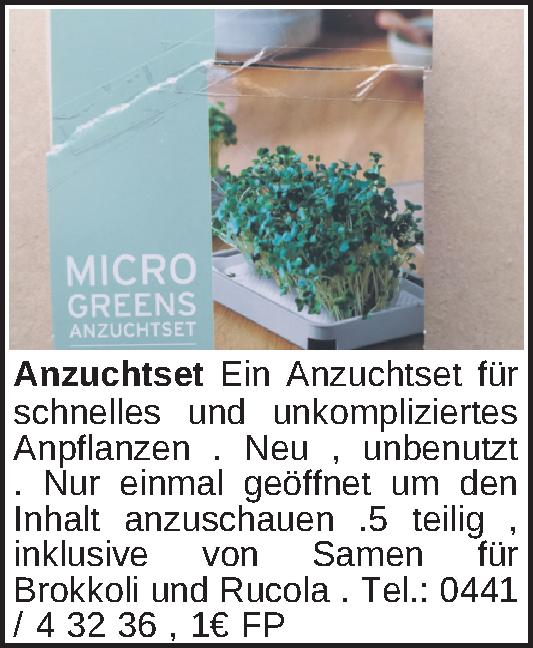 Ein Anzuchtset für schnelles und unkompliziertes Anpflanzen . Neu , unbenutzt . Nur einmal geöffnet um den Inhalt anzuschauen .5 teilig , inklusive von Samen für Brokkoli und Rucola .Tel.: 0441 / 4 32 36