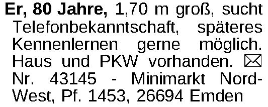 Er, 80 Jahre, 1,70 m groß, sucht Telefonbekanntschaft, späteres Kennenlernen gerne möglich. Haus und PKW vorhanden. ¤ Nr. 43145 - Minimarkt NordWest, Pf. 1453, 26694 Emden