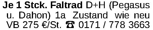 Je 1 Stck. Faltrad D+H (Pegasus u. Dahon) 1a Zustand wie neu VB 275 €/St. 0171 / 778 3663