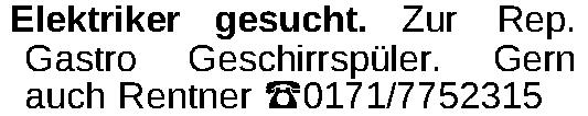 Elektriker gesucht. Zur Rep. Gastro Geschirrspüler. Gern auch Rentner 0171/7752315