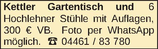 Kettler Gartentisch und 6 Hochlehner Stühle mit Auflagen, 300 € VB. Foto per WhatsApp möglich. ‡ 04461 / 83 780Kontakt