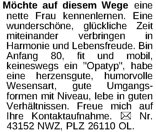 Möchte auf diesem Wege eine nette Frau kennenlernen. Eine wunderschöne, glückliche Zeit miteinander verbringen in Harmonie und Lebensfreude. Bin Anfang 80, fit und mobil, keineswegs ein "Opatyp", habe eine herzensgute, humorvolle Wesensart, gute Umgangsformen mit Niveau, lebe in guten Verhältnissen. Freue mich auf Ihre Kontaktaufnahme. ¤ Nr. 43152 NWZ, PLZ 26110 OL.Kontakt