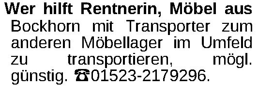 Wer hilft Rentnerin, Möbel aus Bockhorn mit Transporter zum anderen Möbellager im Umfeld zu transportieren, mögl. günstig. 01523-2179296.
