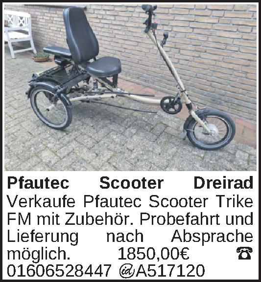 Verkaufe Pfautec Scooter Trike FM mit Zubehör. Probefahrt und Lieferung nach Absprache möglich.Kontakt