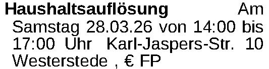 Am Samstag 28.03.26 von 14:00 bis 17:00 Uhr Karl-Jaspers-Str. 10 WesterstedeKontakt