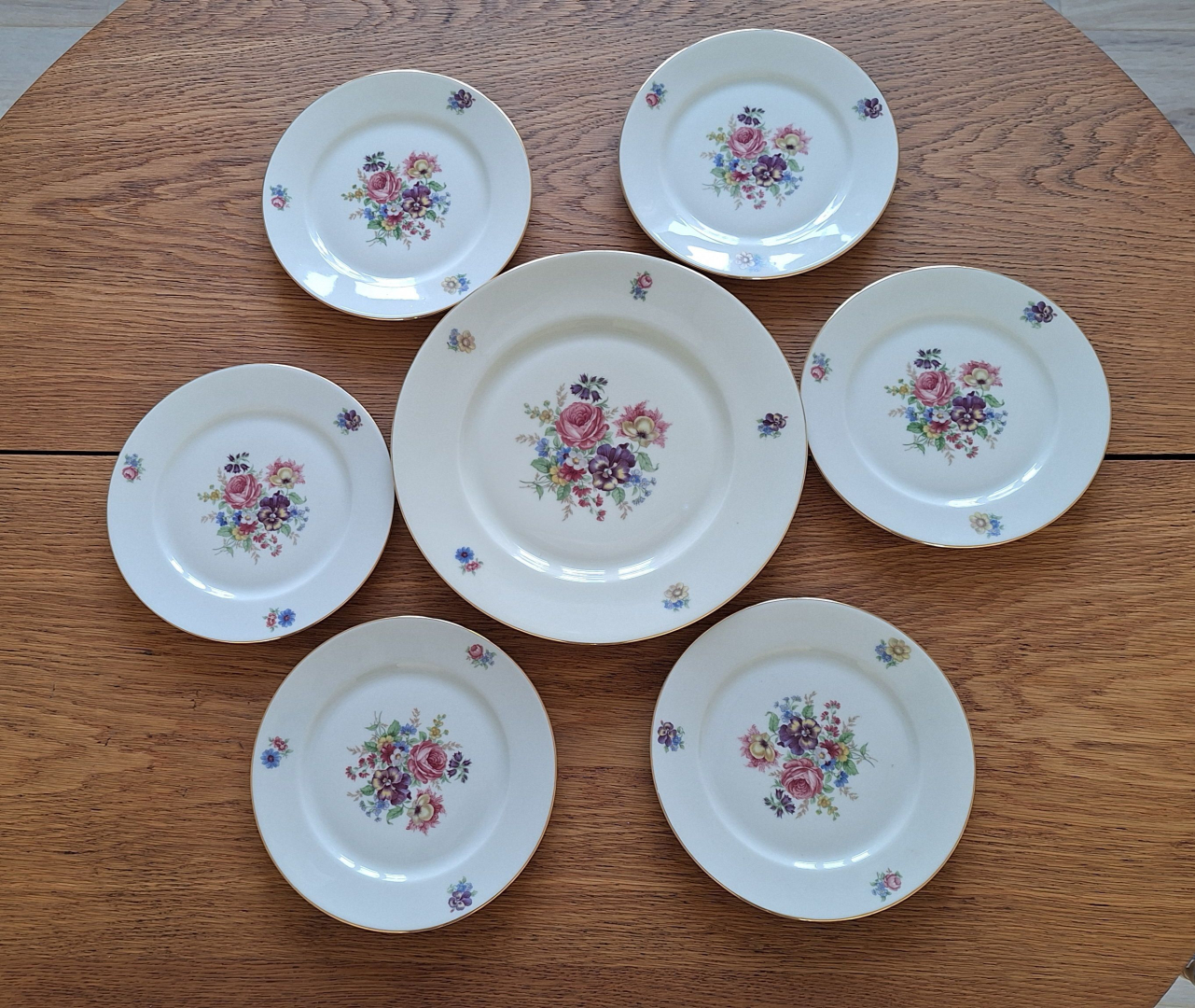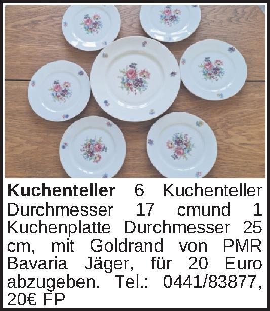 6 Kuchenteller Durchmesser 17 cmund 1 Kuchenplatte Durchmesser 25 cm, mit Goldrand von PMR Bavaria Jäger, für 20 Euro abzugeben.Tel.: 0441/83877