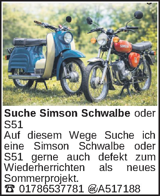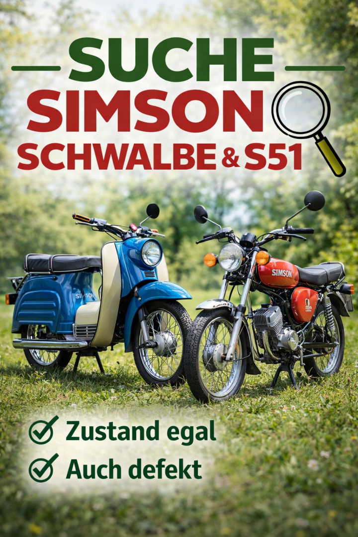Auf diesem Wege Suche ich eine Simson Schwalbe oder S51 gerne auch defekt zum Wiederherrichten als neues Sommerprojekt.01786537781