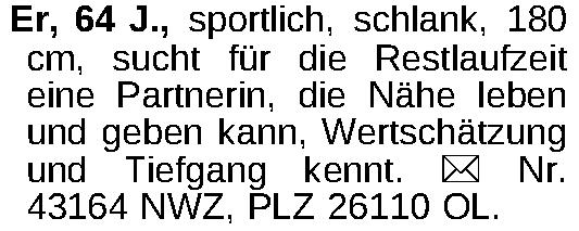 Er, 64 J., sportlich, schlank, 180 cm, sucht für die Restlaufzeit eine Partnerin, die Nähe leben und geben kann, Wertschätzung und Tiefgang kennt. ¤ Nr. 43164 NWZ, PLZ 26110 OL.