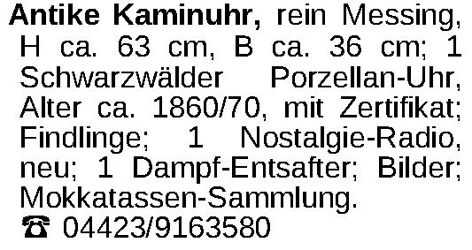 Antike Kaminuhr, rein Messing, H ca. 63 cm, B ca. 36 cm; 1 Schwarzwälder Porzellan-Uhr, Alter ca. 1860/70, mit Zertifikat; Findlinge; 1 Nostalgie-Radio, neu; 1 Dampf-Entsafter; Bilder; Mokkatassen-Sammlung. 04423/9163580