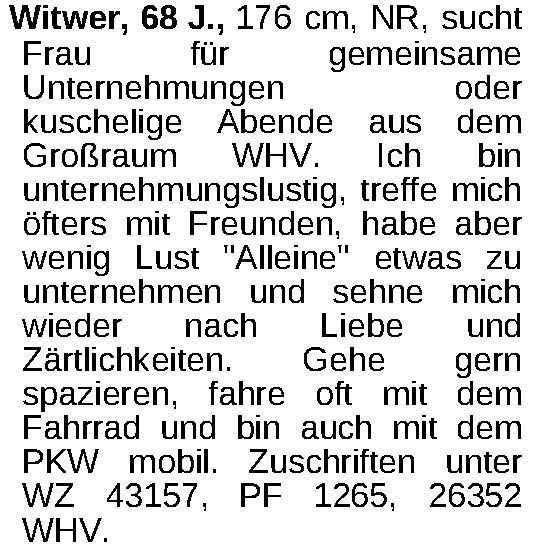 Witwer, 68 J., 176 cm, NR, sucht Frau für gemeinsame Unternehmungen oder kuschelige Abende aus dem Großraum WHV. Ich bin unternehmungslustig, treffe mich öfters mit Freunden, habe aber wenig Lust "Alleine" etwas zu unternehmen und sehne mich wieder nach Liebe und Zärtlichkeiten. Gehe gern spazieren, fahre oft mit dem Fahrrad und bin auch mit dem PKW mobil. Zuschriften unter WZ 43157, PF 1265, 26352 WHV.Kontakt