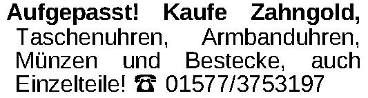 Aufgepasst! Kaufe Zahngold, Taschenuhren, Armbanduhren, Münzen und Bestecke, auch Einzelteile! 01577/3753197