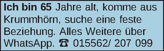 Ich bin 65 Jahre alt, komme aus Krummhörn, suche eine feste Beziehung. Alles Weitere über WhatsApp. 015562/ 207 099