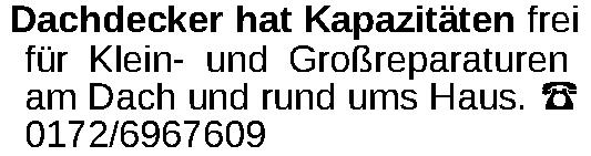 Dachdecker hat Kapazitäten frei für Klein- und Großreparaturen am Dach und rund ums Haus. 0172/6967609