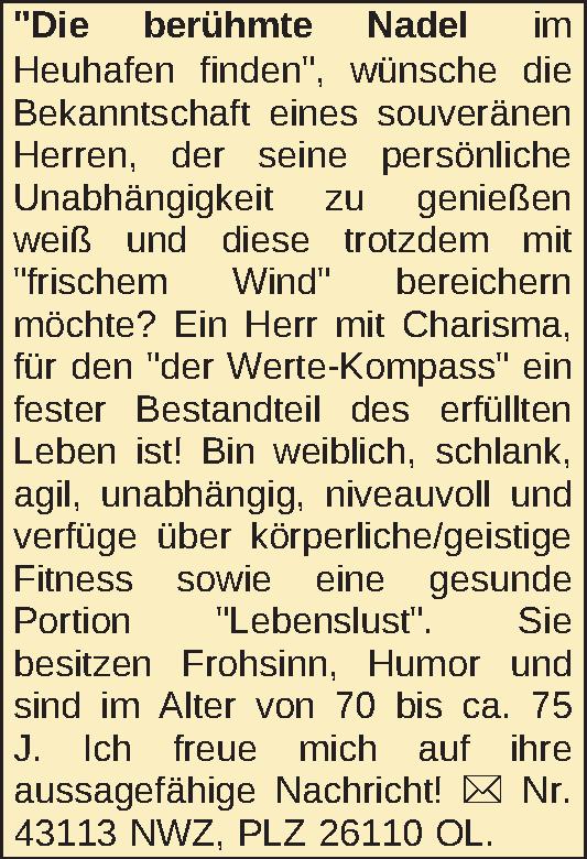 "Die berühmte Nadel im Heuhafen finden", wünsche die Bekanntschaft eines souveränen Herren, der seine persönliche Unabhängigkeit zu genießen weiß und diese trotzdem mit "frischem Wind" bereichern möchte? Ein Herr mit Charisma, für den "der Werte-Kompass" ein fester Bestandteil des erfüllten Leben ist! Bin weiblich, schlank, agil, unabhängig, niveauvoll und verfüge über körperliche/geistige Fitness sowie eine gesunde Portion "Lebenslust". Sie besitzen Frohsinn, Humor und sind im Alter von 70 bis ca. 75 J. Ich freue mich auf ihre aussagefähige Nachricht! ¤ Nr. 43113 NWZ, PLZ 26110 OL.