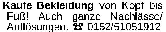 Kaufe Bekleidung von Kopf bis Fuß! Auch ganze Nachlässe/ Auflösungen. 0152/51051912