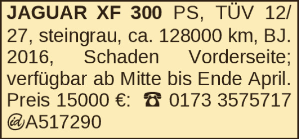 JAGUAR XF 300 PS, TÜV 12/27, steingrau, ca. 128000 km, BJ. 2016, Schaden Vorderseite; verfügbar ab Mitte bis Ende April. Preis 15000 €:   0173 3575717 ¬A517290