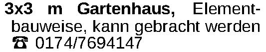 3x3 m Gartenhaus, Elementbauweise, kann gebracht werden ‡ 0174/7694147Kontakt