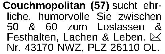 Couchmopolitan (57) sucht ehrliche, humorvolle Sie zwischen 50 & 60 zum Loslassen & Festhalten, Lachen & Leben. ¤ Nr. 43170 NWZ, PLZ 26110 OL.Kontakt