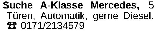 Suche A-Klasse Mercedes, 5 Türen, Automatik, gerne Diesel. 0171/2134579