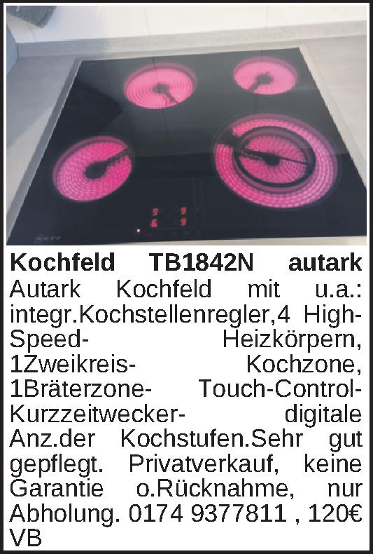 Autark Kochfeld mit u.a.: integr.Kochstellenregler,4 High-Speed- Heizkörpern, 1Zweikreis- Kochzone, 1Bräterzone- Touch-Control-Kurzzeitwecker- digitale Anz.der Kochstufen.Sehr gut gepflegt. Privatverkauf, keine Garantie o.Rücknahme, nur Abholung. 017Kontakt