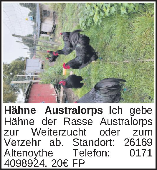 Ich gebe Hähne der Rasse Australorps zur Weiterzucht oder zum Verzehr ab.