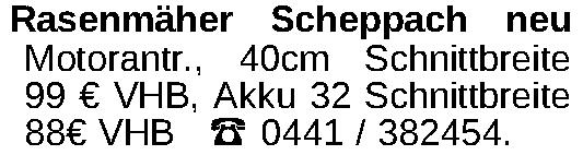 Rasenmäher Scheppach neu Motorantr., 40cm Schnittbreite 99 € VHB, Akku 32 Schnittbreite 88€ VHB 0441 / 382454.