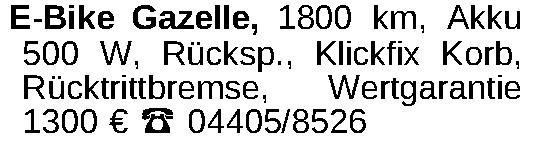 E-Bike Gazelle, 1800 km, Akku 500 W, Rücksp., Klickfix Korb, Rücktrittbremse, Wertgarantie 1300 € ‡ 04405/8526Kontakt