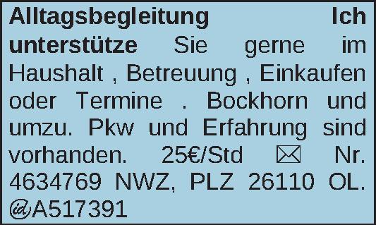 Ich unterstütze Sie gerne im Haushalt , Betreuung , Einkaufen oder Termine . Bockhorn und umzu. Pkw und Erfahrung sind vorhanden. 25€ Std.Kontakt
