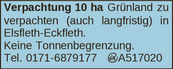 10 ha Grünland zu verpachten (auch langfristig) in Elsfleth-Eckfleth. Keine Tonnenbegrenzung.Tel. 0171-6879177