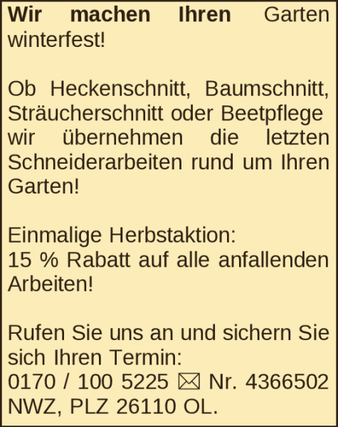 Anzeigentitel: Gartenpflege vom Profi – zuverlässig & flexibel