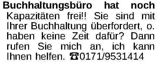 Buchhaltungsbüro hat noch Kapazitäten frei!! Sie sind mit Ihrer Buchhaltung überfordert, o. haben keine Zeit dafür? Dann rufen Sie mich an, ich kann Ihnen helfen. 0171/9531414