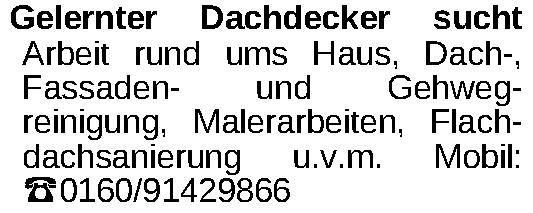 Gelernter Dachdecker sucht Arbeit rund ums Haus, Dach-, Fassadenund Gehwegreinigung, Malerarbeiten, Flachdachsanierung u.v.m. Mobil: ‡0160/91429866Kontakt
