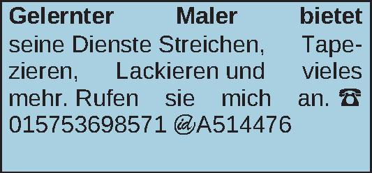 Gelernter Maler bietet seine Dienste Streichen, Tapezieren, Lackieren und vieles mehr. Rufen sie mich an. ‡ 015753698571 ¬A514476Kontakt