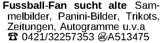 Fussball-Fan sucht alte Sammelbilder, Panini-Bilder, Trikots, Zeitungen, Autogramme u.v.a 0421/32257353 ¬A513475