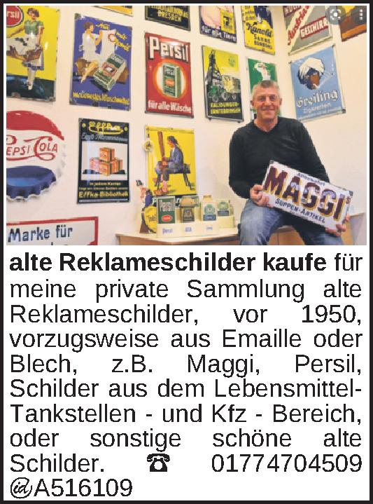 kaufe für meine private Sammlung alte Reklameschilder, vor 1950, vorzugsweise aus Emaille oder Blech, z.B. Maggi, Persil, Schilder aus dem Lebensmittel- Tankstellen - und Kfz - Bereich, oder sonstige schöne alte Schilder. Tel.: 01774704509Kontakt
