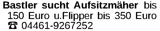 Anzeigentitel: Bastler sucht Aufsitzmäher bis 150 Euro