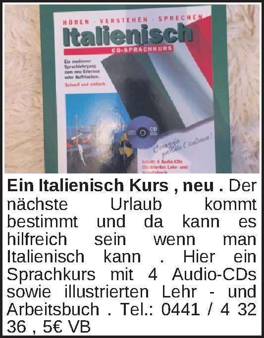 Der nächste Urlaub kommt bestimmt und da kann es hilfreich sein wenn man Italienisch kann . Hier ein Sprachkurs mit 4 Audio-CDs sowie illustrierten Lehr - und Arbeitsbuch .Tel.: 0441 / 4 32 36