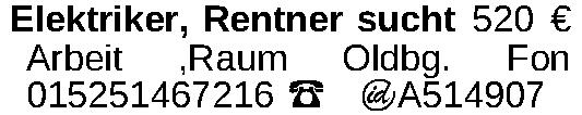 Anzeigentitel: Elektriker, Rentner sucht 520 € Arbeit ,Raum Oldbg. Fon 0152514672116