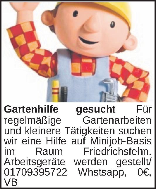 Für regelmäßige Gartenarbeiten und kleinere Tätigkeiten suchen wir eine Hilfe auf Minijob-Basis im Raum Friedrichsfehn. Arbeitsgeräte werden gestellt/01709395722 Whstsapp