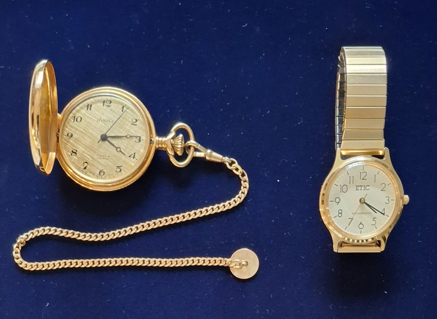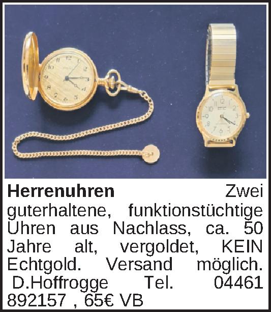 Zwei guterhaltene, funktionstüchtige Uhren aus Nachlass, ca. 50 Jahre alt, vergoldet, KEIN Echtgold. Versand möglich. D.Hoffrogge Tel. 04461 892157