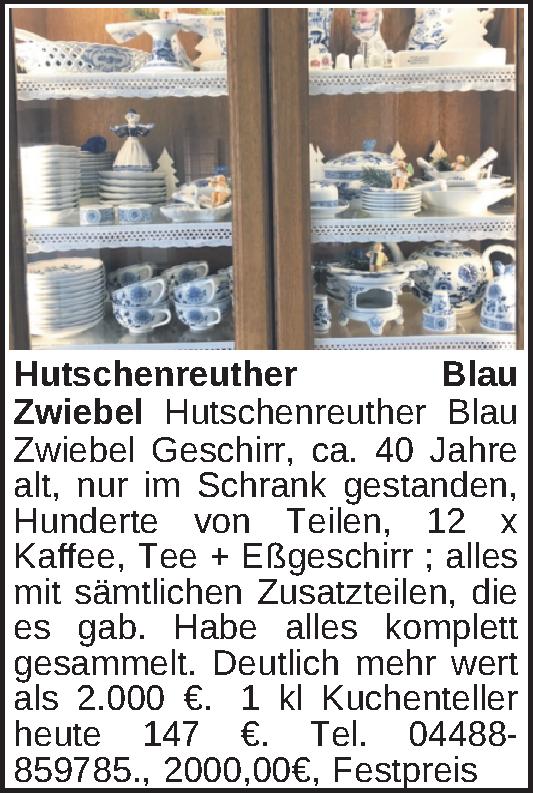 Hutschenreuther Blau Zwiebel Geschirr, ca. 40 Jahre alt, nur im Schrank gestanden, Hunderte von Teilen, 12 x Kaffee, Tee + Eßgeschirr ; alles mit sämtlichen Zusatzteilen, die es gab. Habe alles komplett gesammelt. Deutlich mehr wert als 2.000 €. 1 k