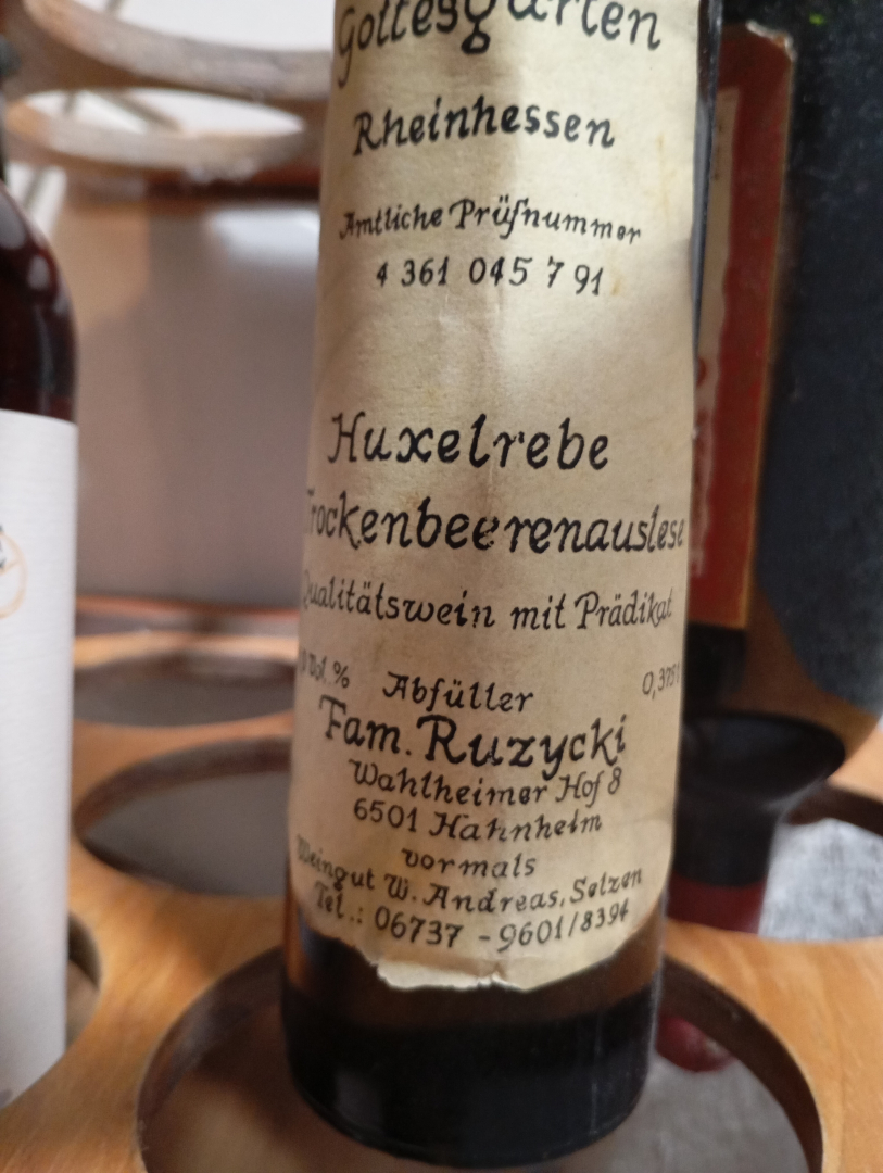 Entdecken Sie den exklusiven *Selzener Gottesgarten Rheinhessen* aus den 1990er Jahren – ein echter Schatz aus dem Weingut Fam. Ruzycki in Hahnheim!Dieser seltene *Huxelrebe Trockenbeerenauslese Qualitätswein mit Prädikat* ist ein Genuss für Kenner und Liebhaber edler Weine. Die sorgfältige Herstellung und die außergewöhnliche Rebsorte verleihen ihm einen unvergleichlichen Geschmack und Charakter.