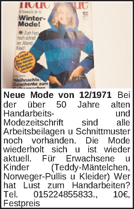 Bei der über 50 Jahre alten Handarbeits- und Modezeitschrift sind alle Arbeitsbeilagen u Schnittmuster noch vorhanden. Die Mode wiederholt sich u ist wieder aktuell. Für Erwachsene u Kinder (Teddy-Mäntelchen, Norweger-Pullis u Kleider) Wer hat Lust zKontakt
