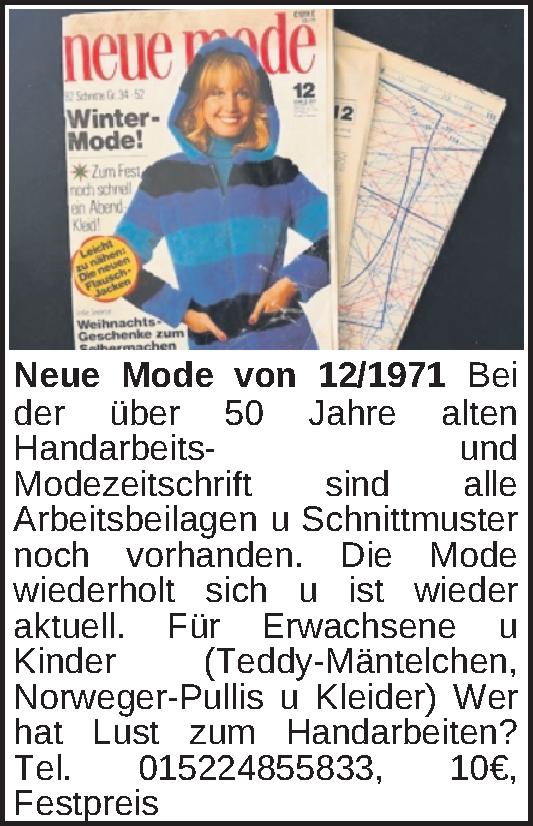 Bei der über 50 Jahre alten Handarbeits- und Modezeitschrift sind alle Arbeitsbeilagen u Schnittmuster noch vorhanden. Die Mode wiederholt sich u ist wieder aktuell. Für Erwachsene u Kinder (Teddy-Mäntelchen, Norweger-Pullis u Kleider) Wer hat Lust z