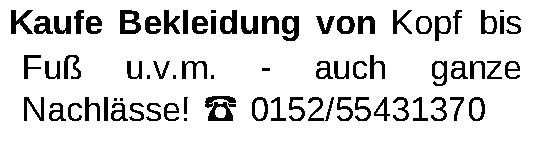 Kaufe Bekleidung von Kopf bis Fuß u.v.m. - auch ganze Nachlässe! ‡ 0152/55431370Kontakt