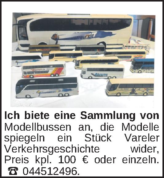 Ich biete eine Sammlung von Modellbussen an, die Modelle spiegeln ein Stück Vareler Verkehrsgeschichte wider, Preis kpl. 100 € oder einzeln. ‡ 044512496.Kontakt