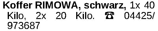 Koffer RIMOWA, schwarz, 1x 40 Kilo, 2x 20 Kilo. ‡ 04425/ 973687Kontakt